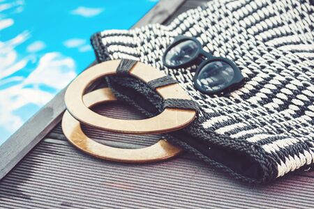 Vintage summer wicker straw beach bag, sun glasses near swimming pool, tropical background