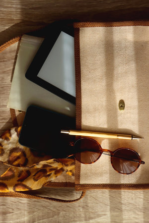 Retro bag with book, tablet, phone, pen, glasses and leopard pattern scarf. Top view, wooden background.
