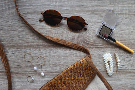Vintage bag, sunglasses, gold and pearl jewerly and glitter eyeshadow on wooden background. Flat lay.