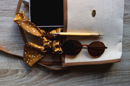Neutral purse with vintage book, mobile phone, golden pen, polka dot scrunchie and round sunglasses. Top view, wooden background.