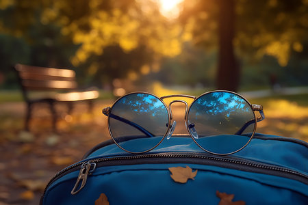 Round sunglasses with a reflective lens sit on a blue backpack amidst fallen leaves, capturing the warm glow of the sunset in a peaceful park setting.