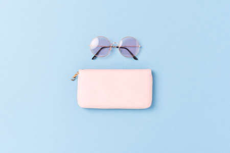 Wallet with sunglasses on pink pastel background. Women's accessories