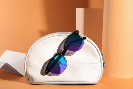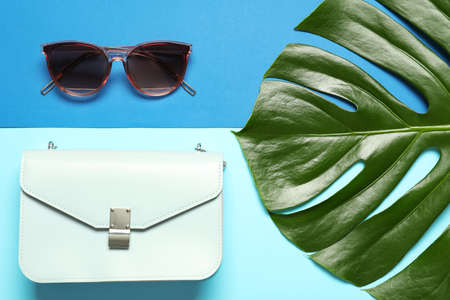 Luxury beautiful beige, nude leather bag on a candy blue, pink background.Fashion concept. Clothing and accessories.women handbag, sun glasses