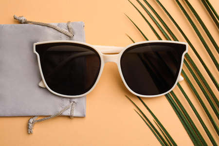 Paper shopping bag with sunglasses on orange pastel background. top view
