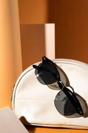 Beautiful womans small beige leather lifestyle bag with black sunglasses, comb and plastic cream box on yellow gold luxury background. Minimal fashion design. Copy space.