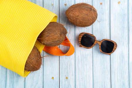 Whole coconuts lying in a yellow bag and glasses on a blue wooden background.