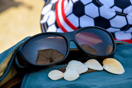 Summer vacation, beach holiday. Reflection of white beach umbrellas in sunglasses. Sunglasses and seashells on background of hat. Relax atmosphere. Close-up. Selective focus.