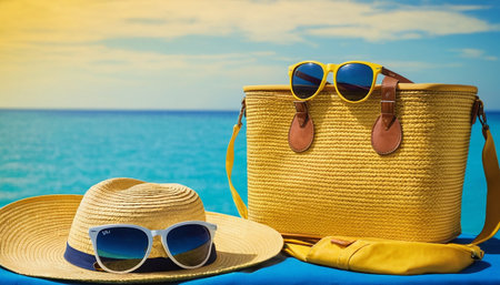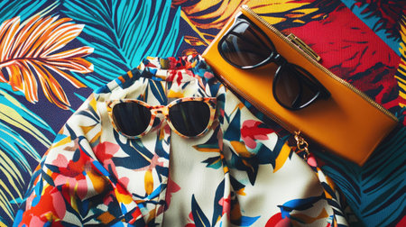 Discover vibrant summer fashion accessories featuring stylish sunglasses and a chic clutch, perfect for a tropical getaway or sunny outdoor events.