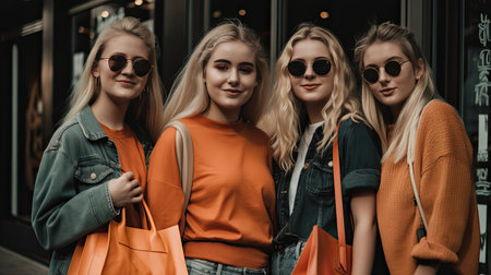 A group of best friends all sporting casual yet trendy outfits exit a shopping center with bags in hand. Their bags come in lively shades of green purple and orange. Their laughter fills the air clearly having enjoyed their shopping adventure.