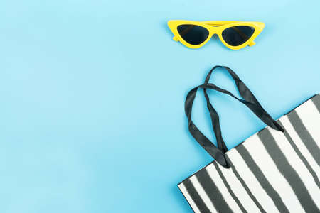 black and white paper shopping bag and yellow sunglasses on blue background with copy space