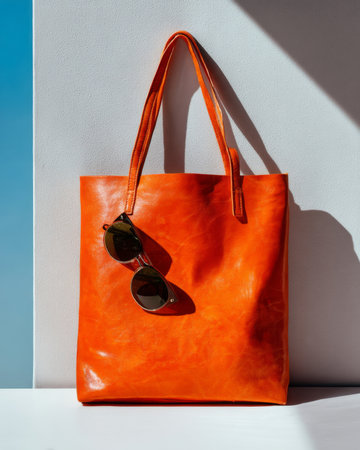 Bright orange leather tote bag with sunglasses clipped on handle, placed against sunlit corner. Your It Bag expressing personality, summer energy and functional minimalism in design.