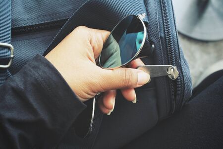 reflection of palms beach on polarized sunglasses over a travel backpack - focus on the right lense - travel concept