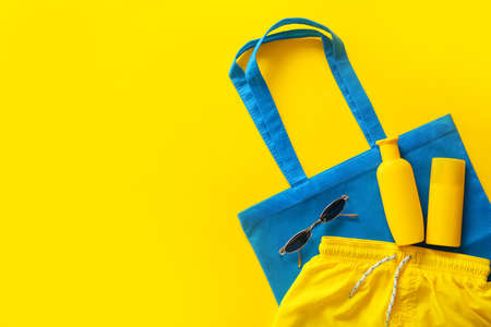 Female summer clothing accessories on yellow background. Concept of travel vacation sea. Hat swimming suit denim shorts leather sandals sunglasses sunscreen sea bag passport phone. Flat lay top view.
