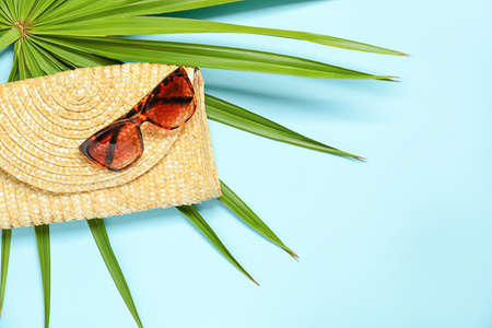 Wicker tote bag and round sunglasses on a table. Flat lay.