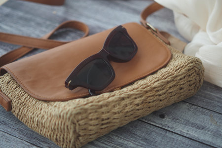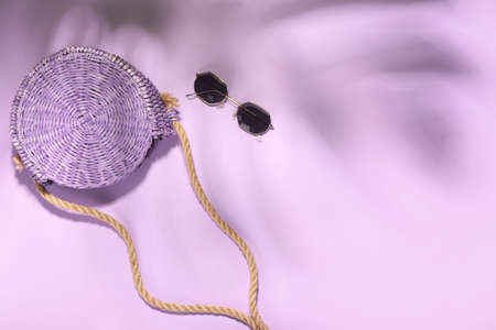 Wicker tote bag and round sunglasses on a table. Selective focus.