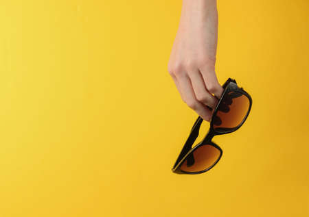 Female hand holds stylish sunglasses on a yellow background. Fashion studio shot