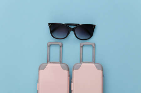 travel planning. Two toy travel luggage and sunglasses on blue pastel background. top view. flat lay