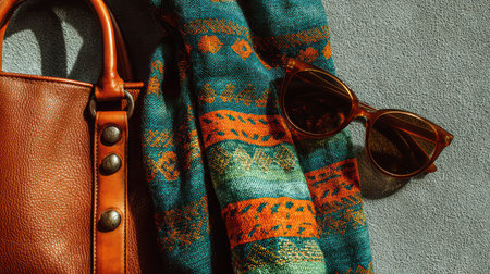 A stylish brown handbag paired with a colorful scarf and chic sunglasses laid on a textured surface, perfect for fashion and lifestyle photography.