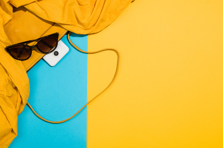 Womans accessories flat lay on colorful background. Top view Blue and yellow pastel colors with copy space around products. Horizontal image or photograph.