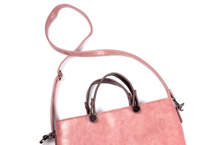 The upper part Is a red women's leather bag of rectangular shape with a long handle over the shoulder