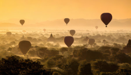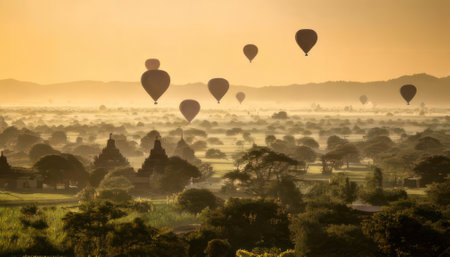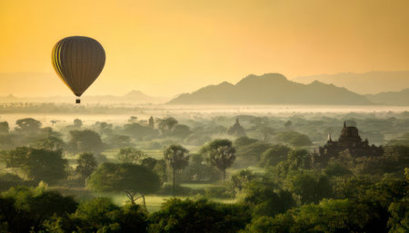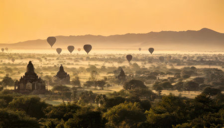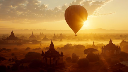 A stunning hot air balloon floats gracefully over the ancient temples of Bagan at sunrise, illuminating the misty landscape with warm golden hues.