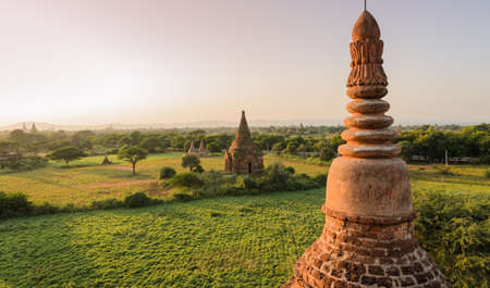 Bagan, Myanmar temples in the Archaeological Park, Burma. Sunrise, green trees.