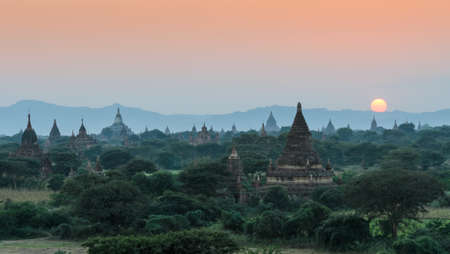 Panorama of Bagan pagodas at sunrise, Myanmar.
