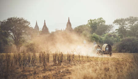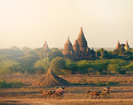 Horse Buggy travels across plains of Bagan against beautiful bell-shaped stupas Myanmar Burma