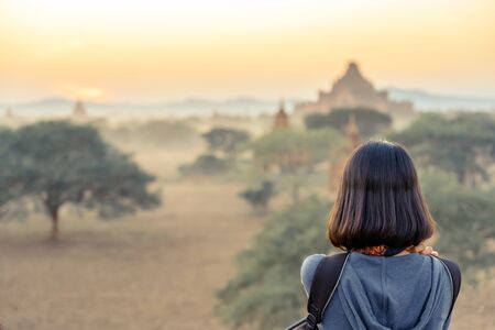 Back wiew of tourists admire and take photography while the sun sets at the ancient pagoda temples in the asian historic heritage city Bagan, Myanmar
