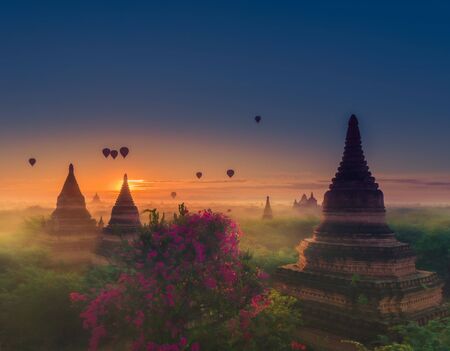 Hot air balloon over misty morning around Temple in Bagan , Myanmar
