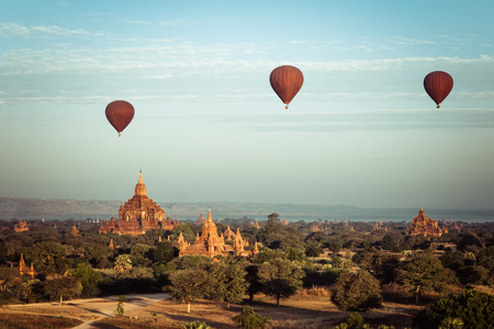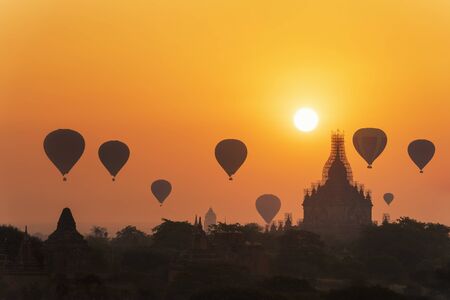 Hot air balloons flying at sunrise over ancient Buddhist Temples at Bagan. Myanmar (Burma) travel landscape and destinations