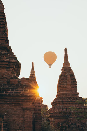 Air balloons flying over the pagoda at Bagan temple complex, Myanmar. Vertical orientation
