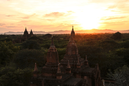Sunrise on Buddhist temples in Bagan, Myanmar. Bagan is an ancient city located in the Mandalay Region of Myanmar.