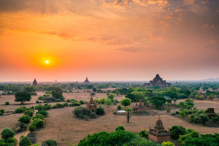Scenic sunset with thousands of historic buddhist temples and stupas in Bagan Archeological area in Myanmar