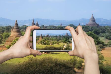 Young man taking a photo with mobile phone in temple stupa scene behind in Bagan, Myanmar