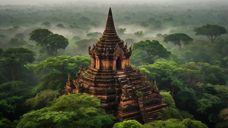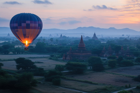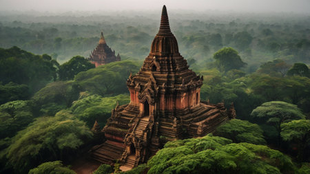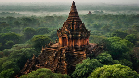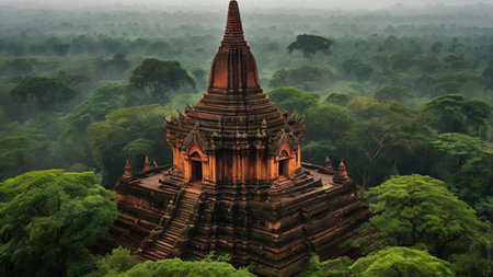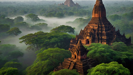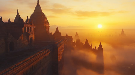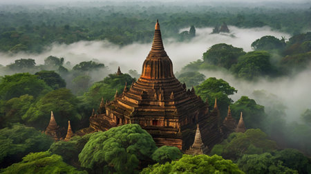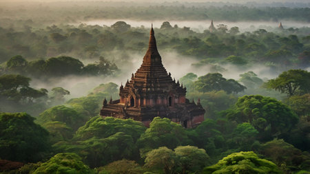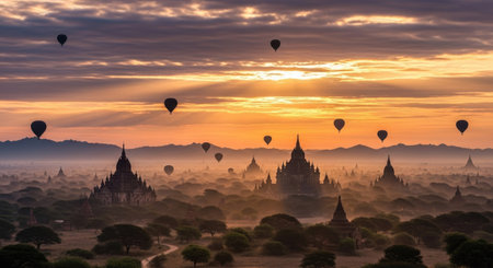 Experience the breathtaking beauty of a sunrise over ancient pagodas in Bagan, Myanmar. The misty landscape and stunning architecture create a serene atmosphere perfect for travel and exploration.