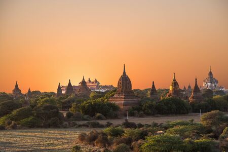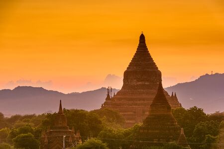Bagan, Myanmar - April 22, 2016 : Group of ancient pagodas in Bagan at Sunset