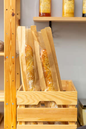 Two fresh baguettes in a package are in a wooden box in a grocery store or cafe.