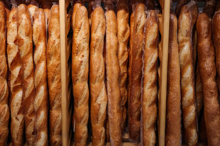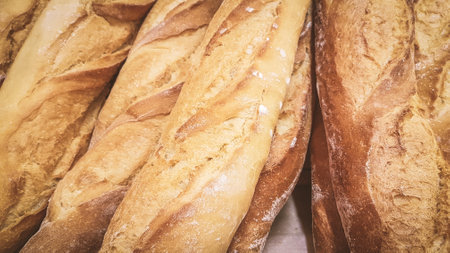 Assortment of freshly baked baguette breads for sale on counter of shop, market or bakery. Pastry, breakfast, food and traditional french cuisine concept