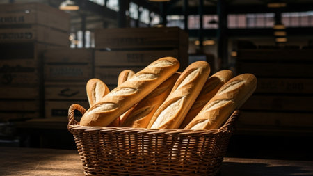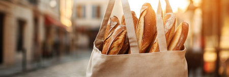 A rustic, relaxed scene with a tote bag filled with crispy baguettes, subtly evoking the essence of a Parisian morning, with soft lighting and an authentic street backdrop, banner