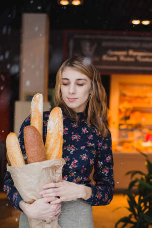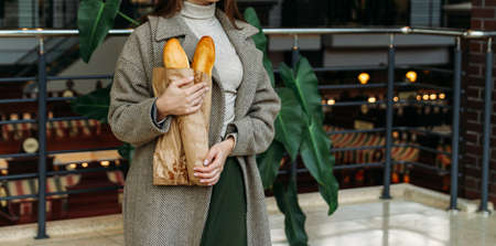 a girl in a coat is standing in a store with a baguette bag, breakfast, shopping, going to a grocery store.behind plants and market
