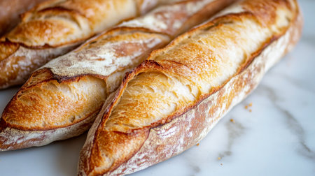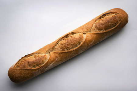 A detailed shot of a freshly baked baguette with a crispy crust and soft, airy interior, set on a clean, white background to emphasize its texture.