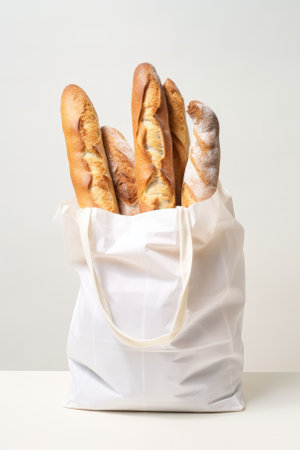 Artisan Sourdough Baguettes Beautifully Arranged in a Reusable Linen Bag on a Rustic Table
