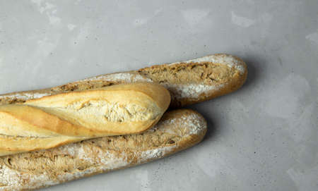 Three baguettes lying on top of each other on a gray background. Whole grain baguette. Place for text.