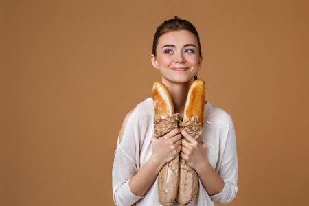 Portrait of beautiful smiling young woman holding paper bag with bread on studio yellow background. girl with paper bag with fresh fragrant long loaf. copy space
