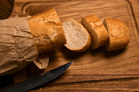 Fresh baguette in a craft package partly sliced and bread knife on wooden cutting board