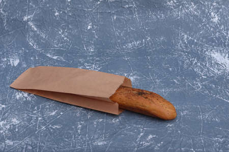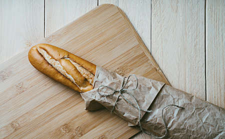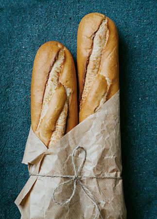 Baguette bread, french stick, wrapped in brown paper tied with string. Recycle packaging concept