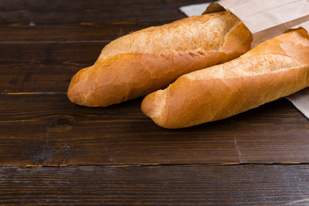 French traditional baguettes in paper bags on wooden table background. High quality photo