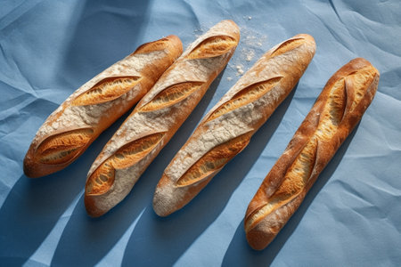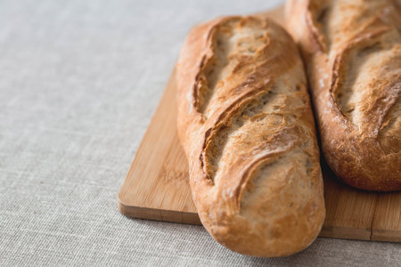 Crusty baguettes in parchment paper on kitchen table, warm golden brown color. Freshly baked bread concept.