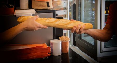 Shopkeeper baker - customer buying a baguette of fresh bread in his bakery in France